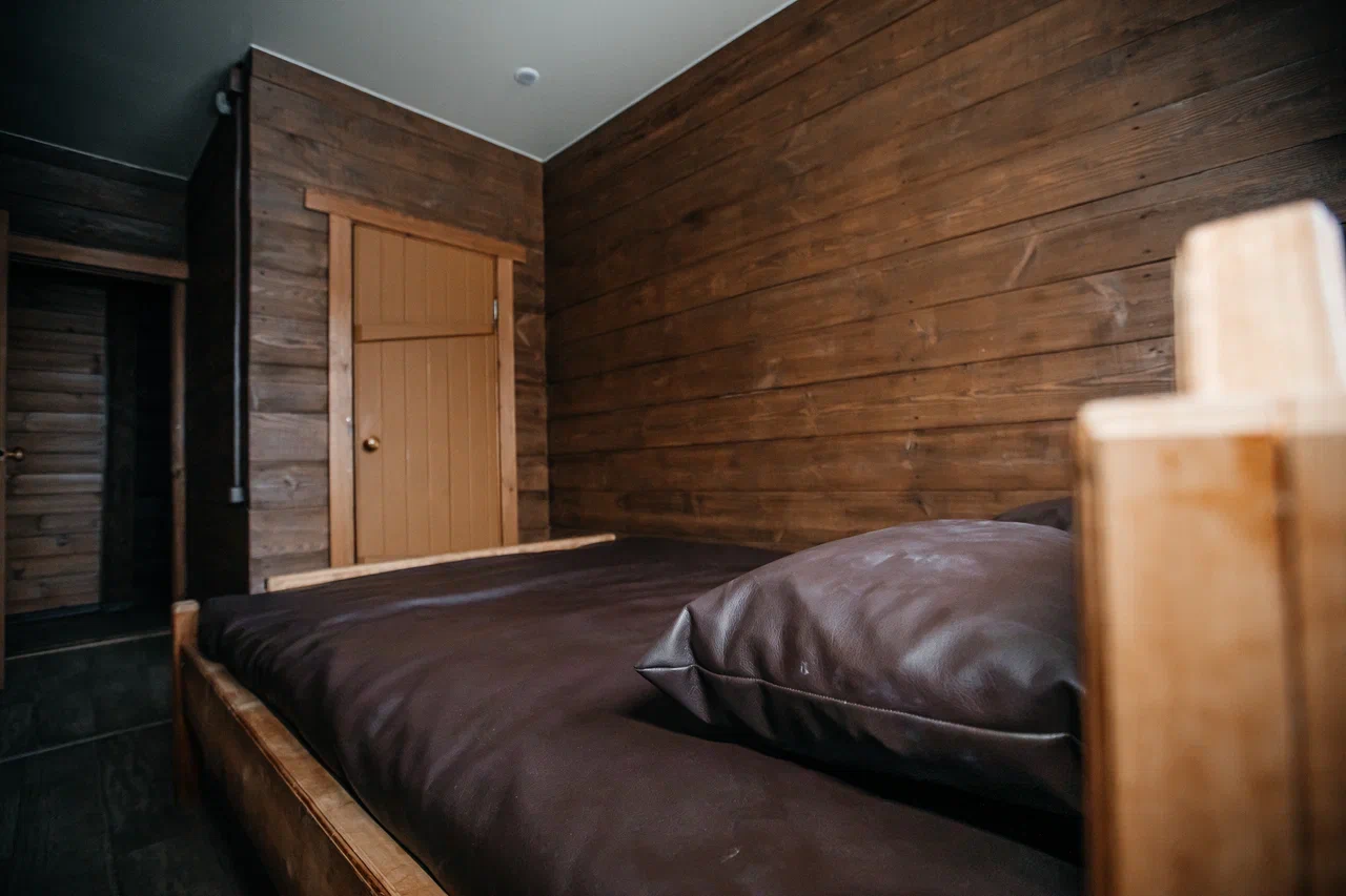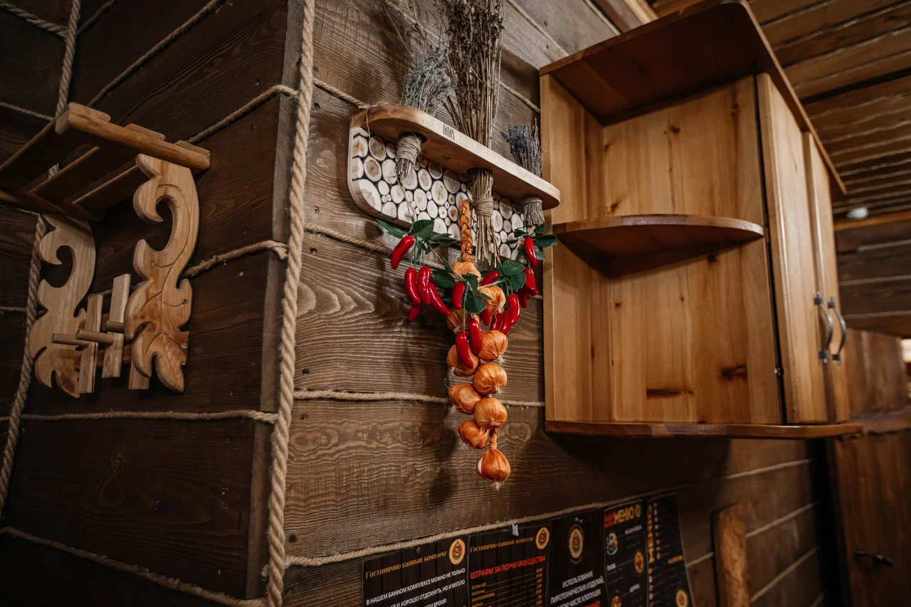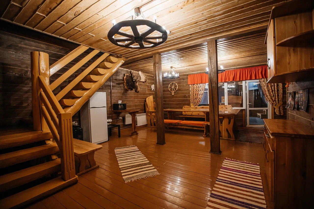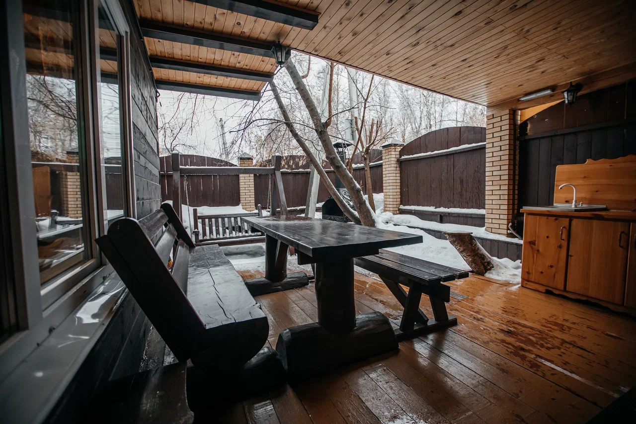 Есть дворик с мангальной площадкой, где можно приготовить вкуснейшие блюда на мангале. На втором этаже две уютные спальни с большими деревянными кроватями и холл с настольным теннисом и настольным футболом. После банных процедур можно попить чай на травах в уютной комнате отдыха.