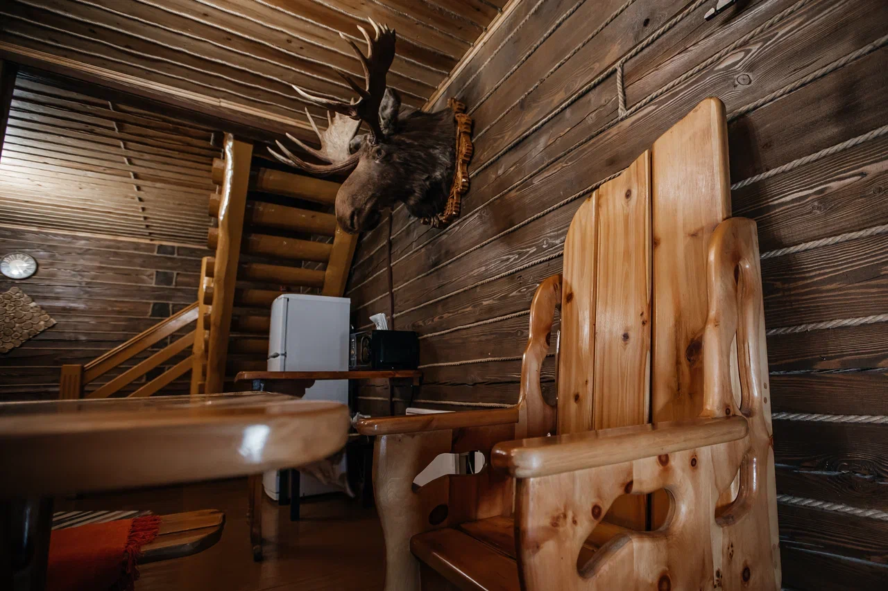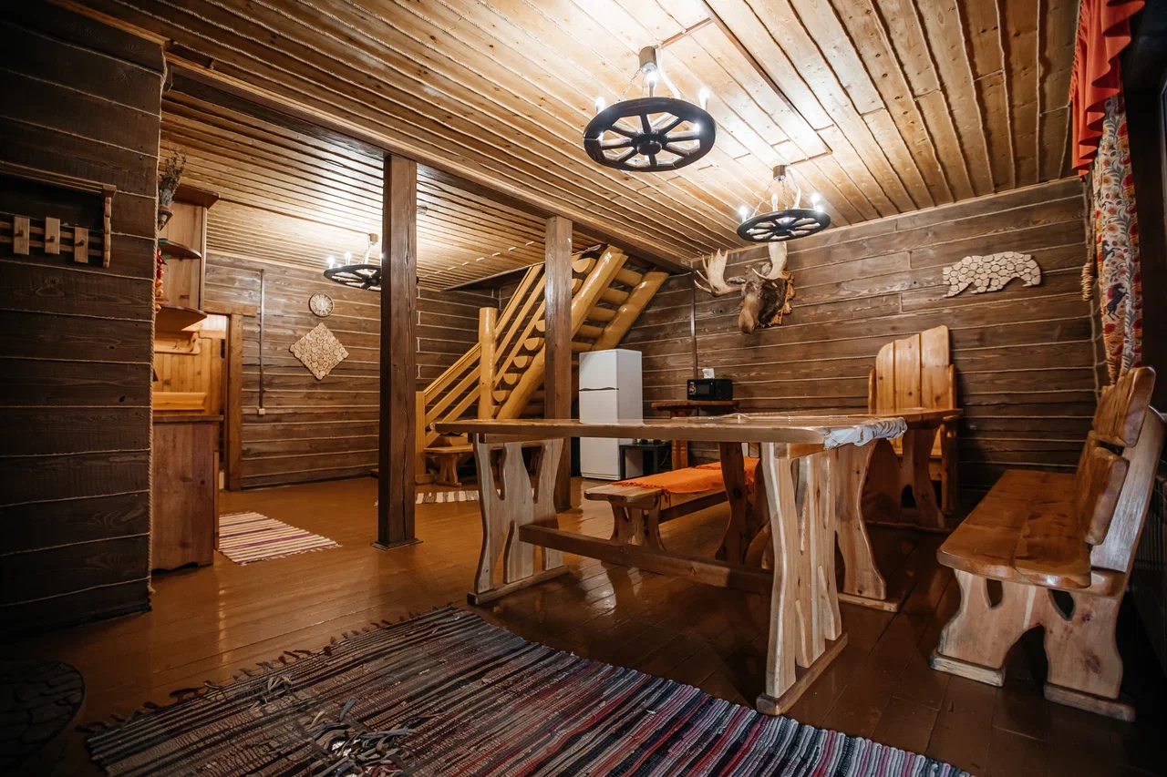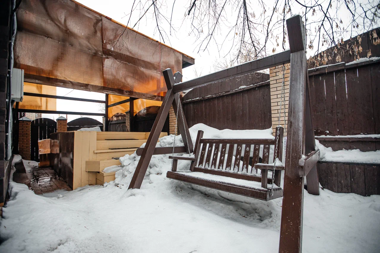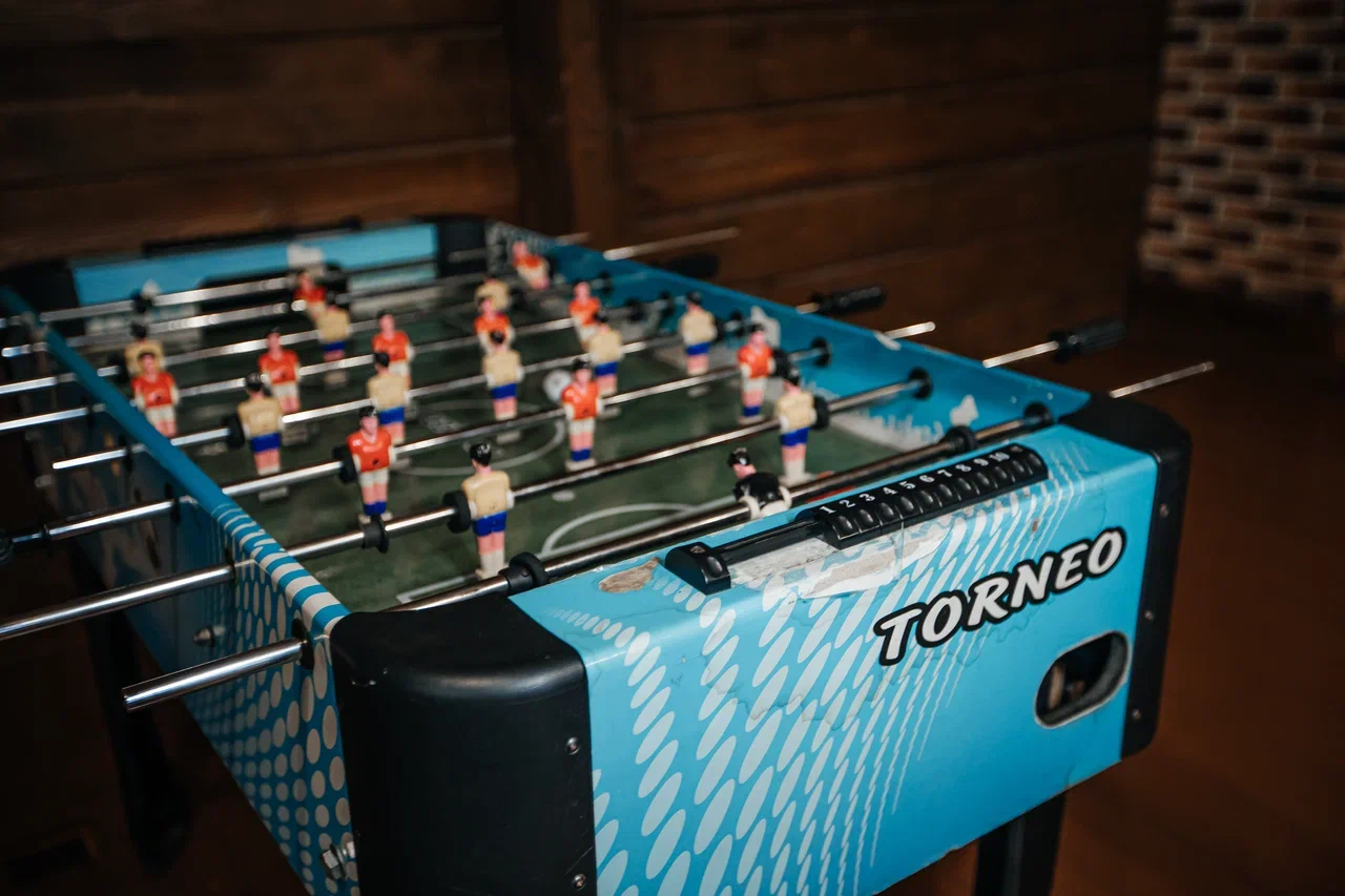 Есть дворик с мангальной площадкой, где можно приготовить вкуснейшие блюда на мангале. На втором этаже две уютные спальни с большими деревянными кроватями и холл с настольным теннисом и настольным футболом. После банных процедур можно попить чай на травах в уютной комнате отдыха.
